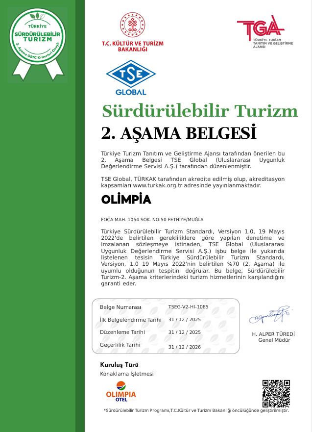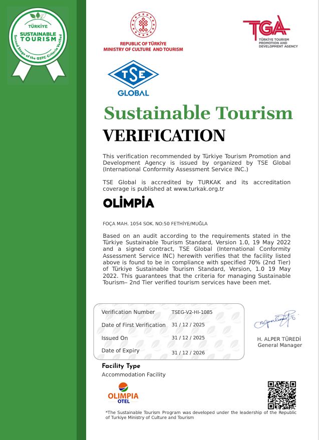 Olimpia Beach Otel, çevreye duyarlılığın en önemli kanıtlarından biri olan “Sürdürülebilir Turizm Sertifikasına sahiptir. Sertifikalarımızı incelemek için